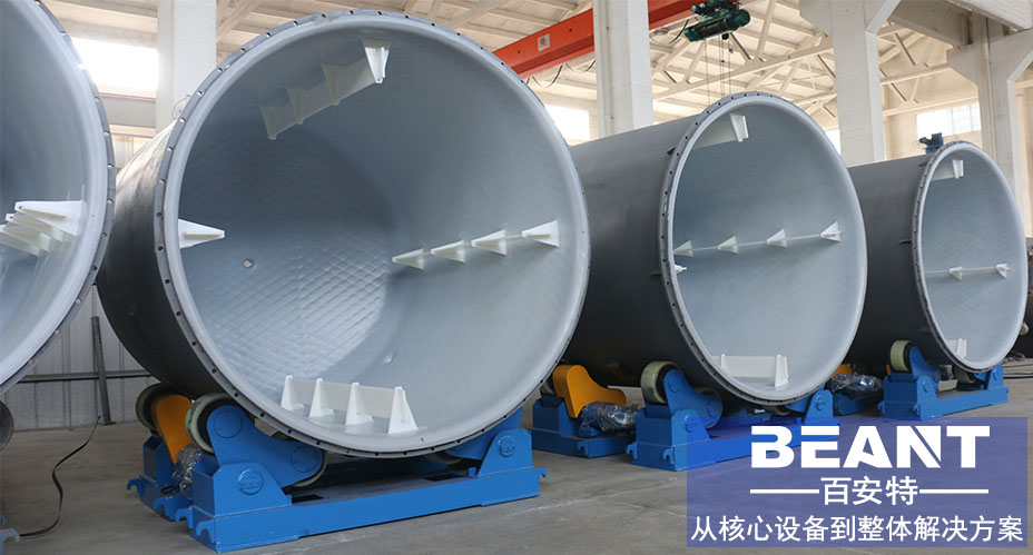 此項工藝技術為一種旋轉燒結成型的工藝,而該項工藝實施的設備也是先進的自動化控制的工藝設備。我公司在應用此項技術的基礎上開發出雙軸線旋轉成型工藝(雙軸線旋轉成型是由于被制造設備在制造過程中被夾持在一個旋轉體內,而該轉動體使被制造設備呈兩個軸線方向同時轉動,最后制得的設備的工藝過程。)滾涂工藝為整體一次成型,無開裂、無滲透,內襯層與鋼基體之間的粘合力強,當設備處于負壓操作條件下,不會使襯里層被吸癟或被剝離金屬基體表面。